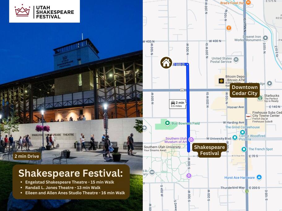 WHAT GUESTS LOVE • Prime Location – 12 min Walk to Shakespeare Festival & Downtown • Chef’s Kitchen – Fully stocked for home-cooked meals • Blazing-Fast Wi-Fi – 1-Gig Fiber for work & streaming • Smart Entertainment – 55” TV w/ Netflix, Disney+, Amazon • Adventure Ready – Hiking, skiing, & national parks nearby LIVING ROOM Relax after a day of exploring—cozy up with Netflix or a good book. • Comfortable Sofa w/ Blankets & Pillows • 55” Smart TV | Streaming Apps CHEF’S KITCHEN & DINING Cook like a pro in a fully stocked kitchen, perfect for family meals. • Appliances – Stove, Oven, Microwave, Fridge, Dishwasher • Drip Coffee Maker, French Press + Coffee & Creamer • Toaster, Blender, Electric Water Kettle, Rice Maker • Cookware, Bakeware, Spices, & Essentials • Dining Table for 4 BEDROOMS A restful night’s sleep awaits in two thoughtfully designed rooms with fresh linens. • Two Queen-Bed Rooms BATHROOM Sparkling clean full bathroom with spa-like rain showers. • Walk-In Showers w/ Rainfall Heads • Towels, Hair Dryers, & Toiletries Provided • In-Unit Washer & Dryer • Iron & Ironing board FREE PARKING • Free Street Parking Available HEATING & COOLING • Portable A/C Units in Bedrooms and Common Rooms • Central Heat Keeps You Warm in the Winters SUPER-FAST WI-FI 1-Gig Fiber – Work, Stream & Browse Lag-Free! ENTERTAINMENT & EXTRAS • Board Games, Playing Cards, and Puzzles • Nearby Golf Courses, Hiking, Bike Trails & Skiing SECURITY • Equipped with Ring Security Cameras (exterior only). • Privacy film on windows EXPLORE NEARBY • Utah Shakespeare Festival – 5 Min Drive • Cedar Breaks National Monument – 35 Min Drive • Brian Head Resort – 30 Min Drive • Zion National Park – 1+ Hr Drive • Local Hot Springs – 1.5 Hr Drive Book now & experience the best of Cedar City! Cedar City License No: 451072