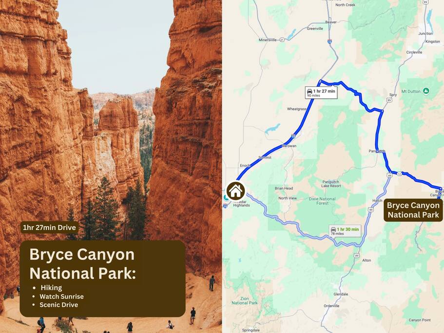 WHAT GUESTS LOVE "Close to Zion, Bryce, and Kanarraville Falls—amazing drives!" "Perfect for home-cooked dinners during our long stay." "The home has impeccable taste in furnishings and décor—beautiful, functional, and thoughtfully designed for comfort." KEY FEATURES • Prime Location • Chef’s Kitchen • 55" Smart TV • 1-Gig Fiber • Workstation • Free EV Charger • Flexible Self-Checkin LIVING ROOM "Such a comfy space to relax after a day of hiking." • Comfortable Sofas w/ Blankets & Pillows • 55” Smart TV | Streaming Apps • Decorative Fireplace CHEF’S KITCHEN & DINING "Kitchen had everything we needed—even for cooking full meals!" • Stainless Steel Appliances • Drip & Pod Coffee Maker, French Press + Coffee & Creamer • Toaster, Blender, Electric Water Kettle, Rice Maker • Cookware, Bakeware, Spices, & Essentials • Dining Table for 6 BEDROOMS "Cozy, quiet, and perfect for a good night’s sleep." • King Suite – King Bed | En-Suite Bathroom | Full-Length Mirror • Queen Room – Queen Bed | Mirror • Twin Room – 2 Twin Beds (Trundle) | Desk & Chair BATHROOMS Two stylish & sparkling clean full bathrooms with spa-like rain showers. • Walk-In Showers w/ Rainfall Heads • Towels, Hair Dryers, & Toiletries Provided • In-Unit Washer & Dryer LAUNDRY Conveniently throw your laundry in the wash after a long day out hiking. • In-Unit Washer & Dryer • Laundry Detergent & Dryer Sheets • Iron & Ironing board FREE PARKING & EV CHARGER • Driveway for 2 Cars | Additional Street Parking Available • EV Charger – Level 2 (Tesla & Other EVs) HEATING & COOLING • Window A/C Units in Bedrooms and Common Rooms • Central Heat Keeps You Warm in the Winters SUPER-FAST WI-FI 1-Gig Fiber – Work, Stream & Browse Lag-Free! ENTERTAINMENT & EXTRAS "We played games and chatted for hours in the cozy living room." • Board Games, Playing Cards, and Puzzles • Nearby Golf Courses, Hiking, Bike Trails & Skiing SECURITY • Equipped with Ring Security Cameras (exterior only). • Privacy tint on windows EXPLORE NEARBY "Close to Zion, Bryce, and Kanarraville Falls—amazing drives!" "Walk to restaurants and the Utah Shakespeare Festival." • Utah Shakespeare Festival – 5 Min Drive • Cedar Breaks National Monument – 35 Min Drive • Brian Head Resort – 30 Min Drive • Zion National Park – 1+ Hr Drive • Local Hot Springs – 1.5 Hr Drive Book now & experience the best of Cedar City! Cedar City License No: 451072